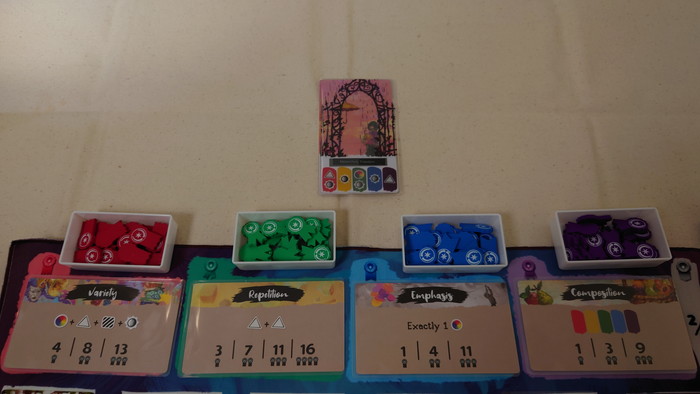 左端の芸術カードの上にパレットトークンを1つ置きます。もともと1つ乗っていたので2つになりました。