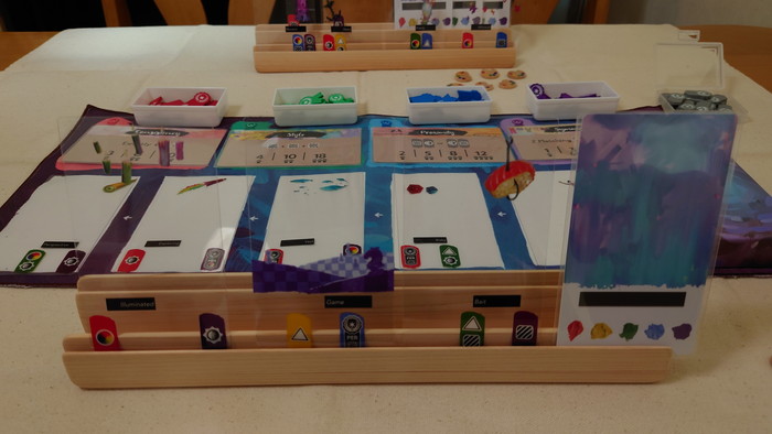 カラフルな4ヶ所に今回のゲームで使う得点カードを置き、下の白いエリアには芸術カードを並べます。